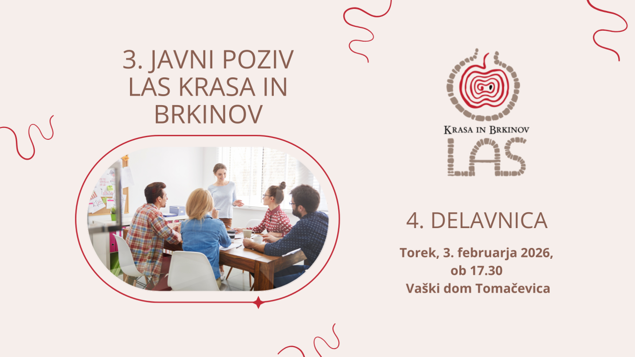 Odprt je 3. Javni poziv LAS Krasa in Brkinov. Ob tej priložnosti vas obveščamo, da bodo izvedene tudi delavnice za povezovanje projektnih idej ter so namenjene potencialnim prijaviteljem na javni poziv LAS Krasa in Brkinov, zlasti podjetjem, podjetnikom posameznikom, društvom, zavodom in drugim lokalnim akterjem, ki želijo razviti trajnostno naravnane projekte z lokalnim učinkom. Delavnica bo potekala: